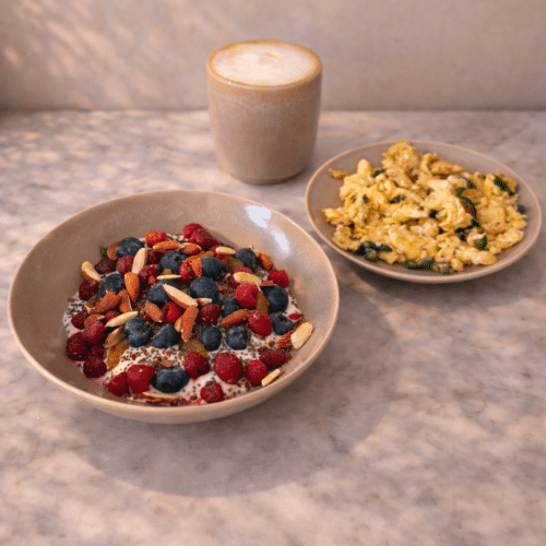 - Serve scrambled eggs with Greek yogurt power bowl and coffee.