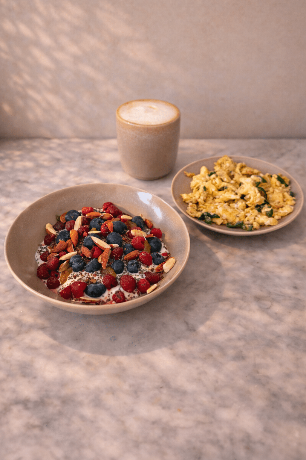 - Serve scrambled eggs with Greek yogurt power bowl and coffee.