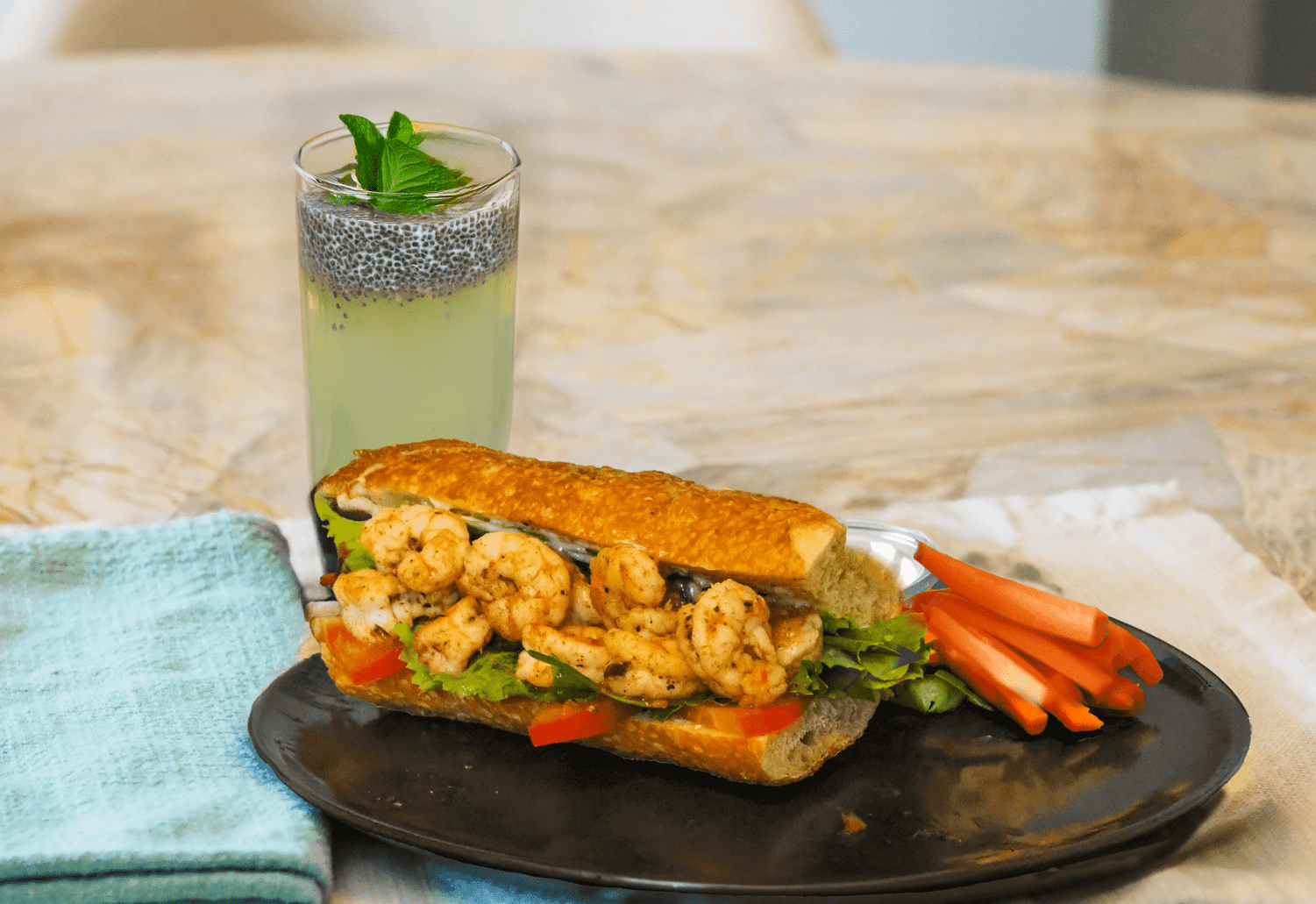- Serve the grilled shrimp po' boys with carrot sticks and hummus and chia fresca. Enjoy!