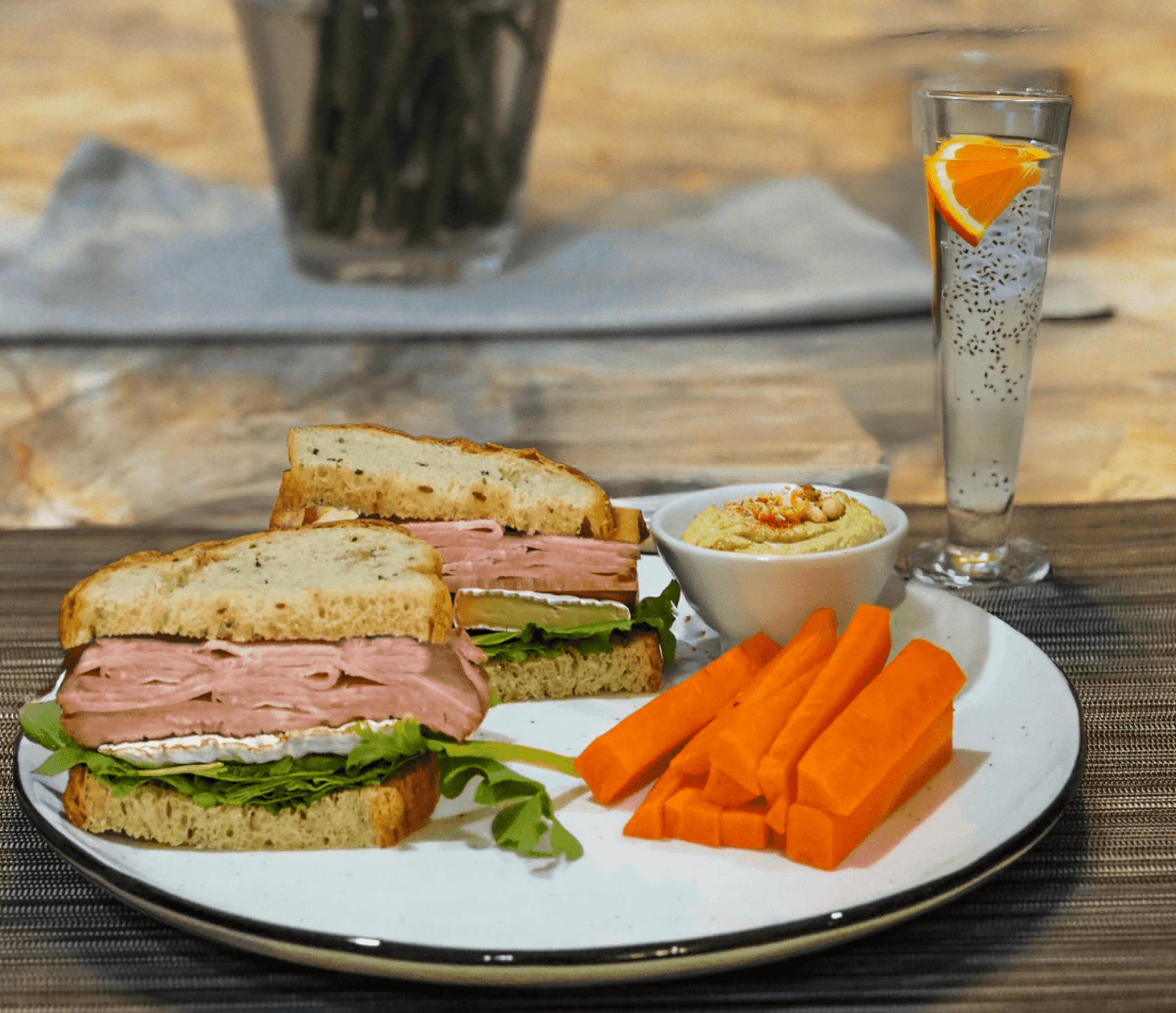 - Serve the sandwich with carrots, hummus, pickle spears, and orange chia sparkling water.