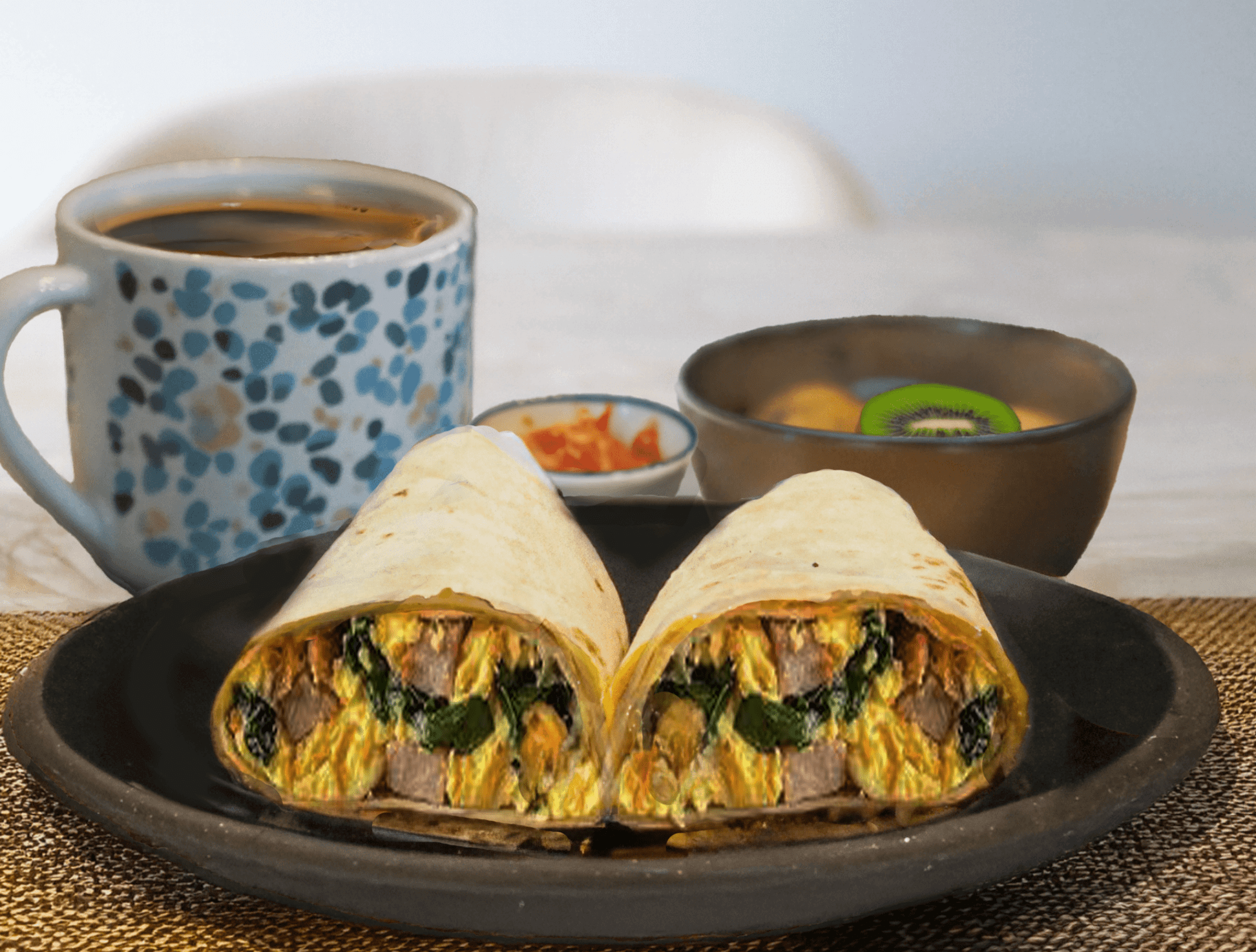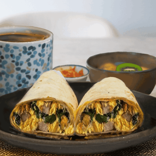 • Serve wraps with kimchi, fruit, and coffee.