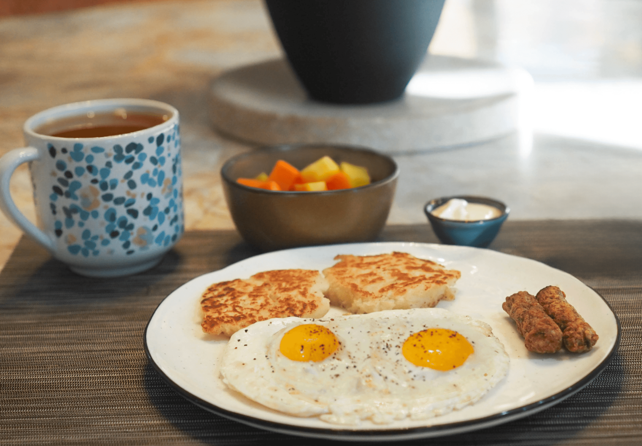• Assemble plates: Serve the potato pancakes with eggs, sausage, fresh fruit, and coffee.