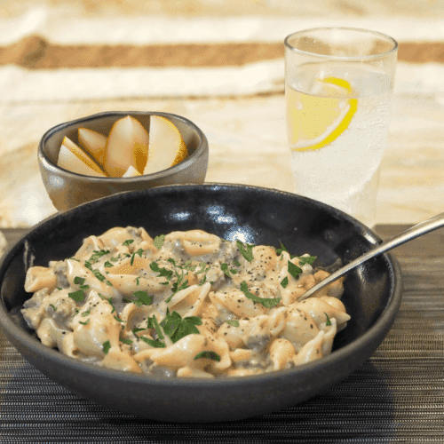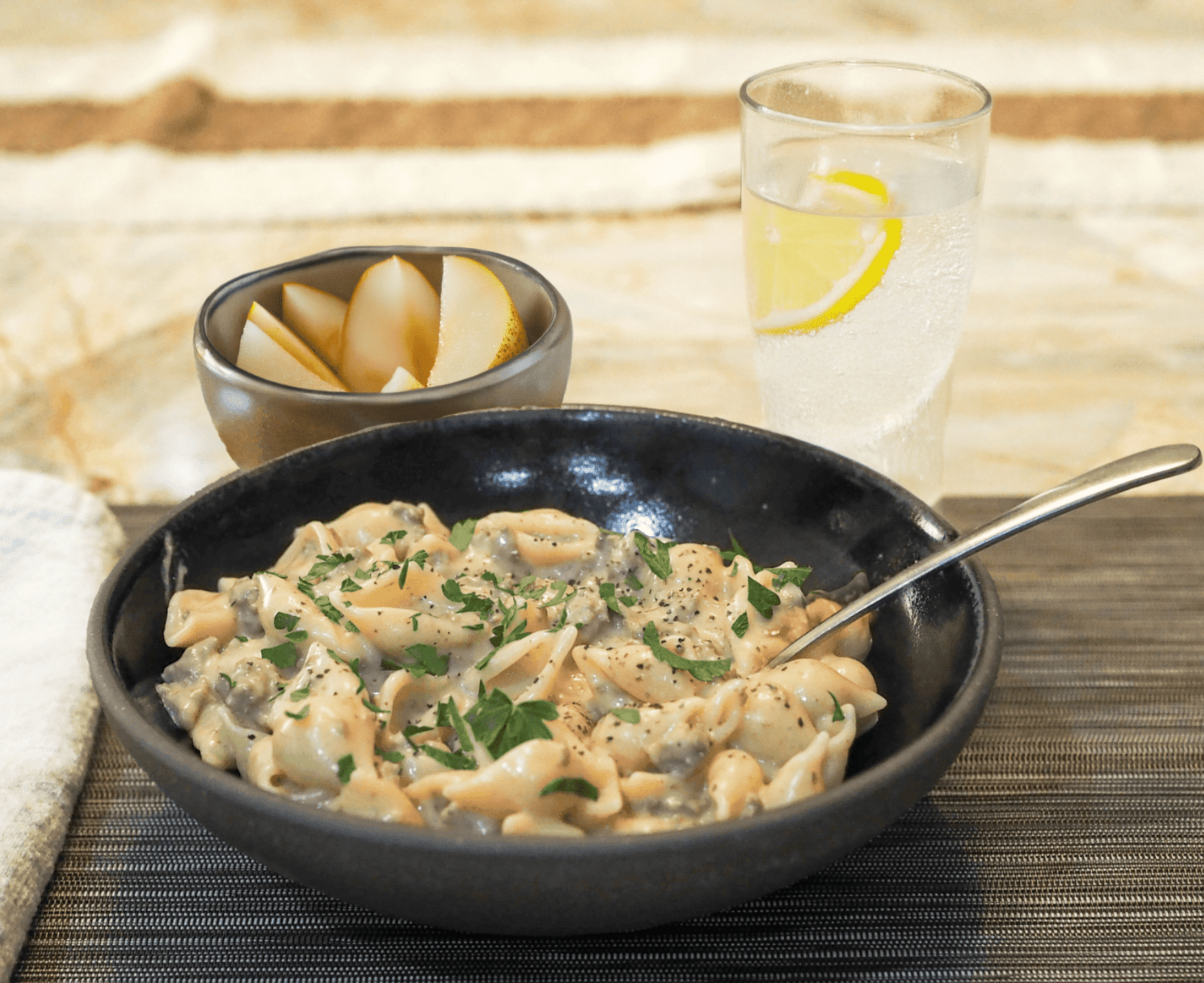 - Serve the hamburger helper warm with a side of sliced pears and a glass of cold lemon sparkling water. Enjoy!