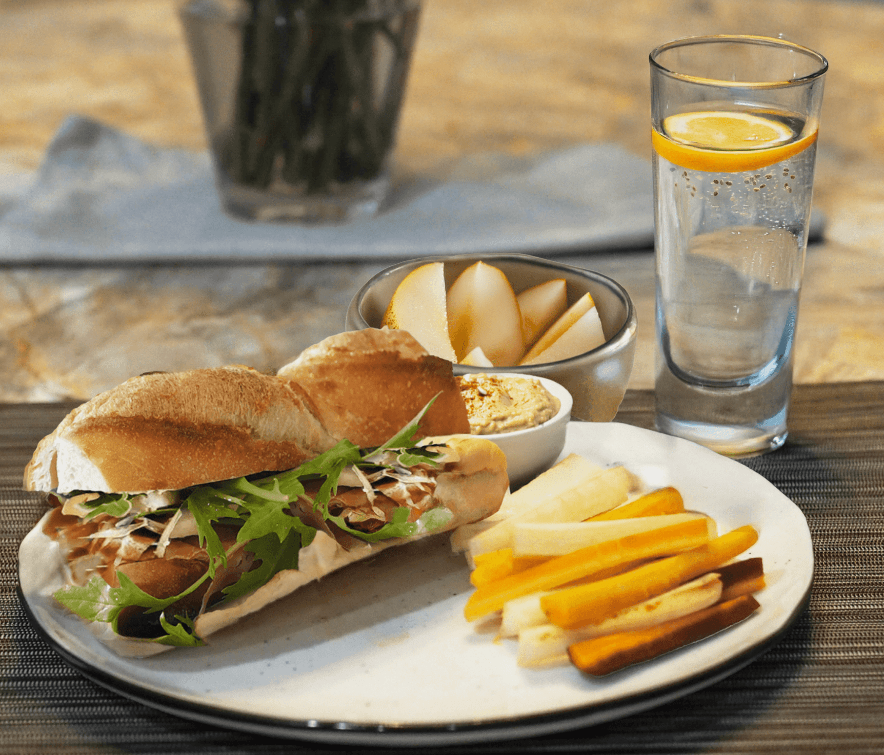 - Serve the jambon beurre with carrot sticks, hummus, sliced pears, and lemon chia sparkling water.