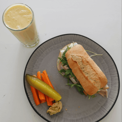 - Serve the jambon beurre with carrot sticks, hummus, pickle spears, and mango lassi.