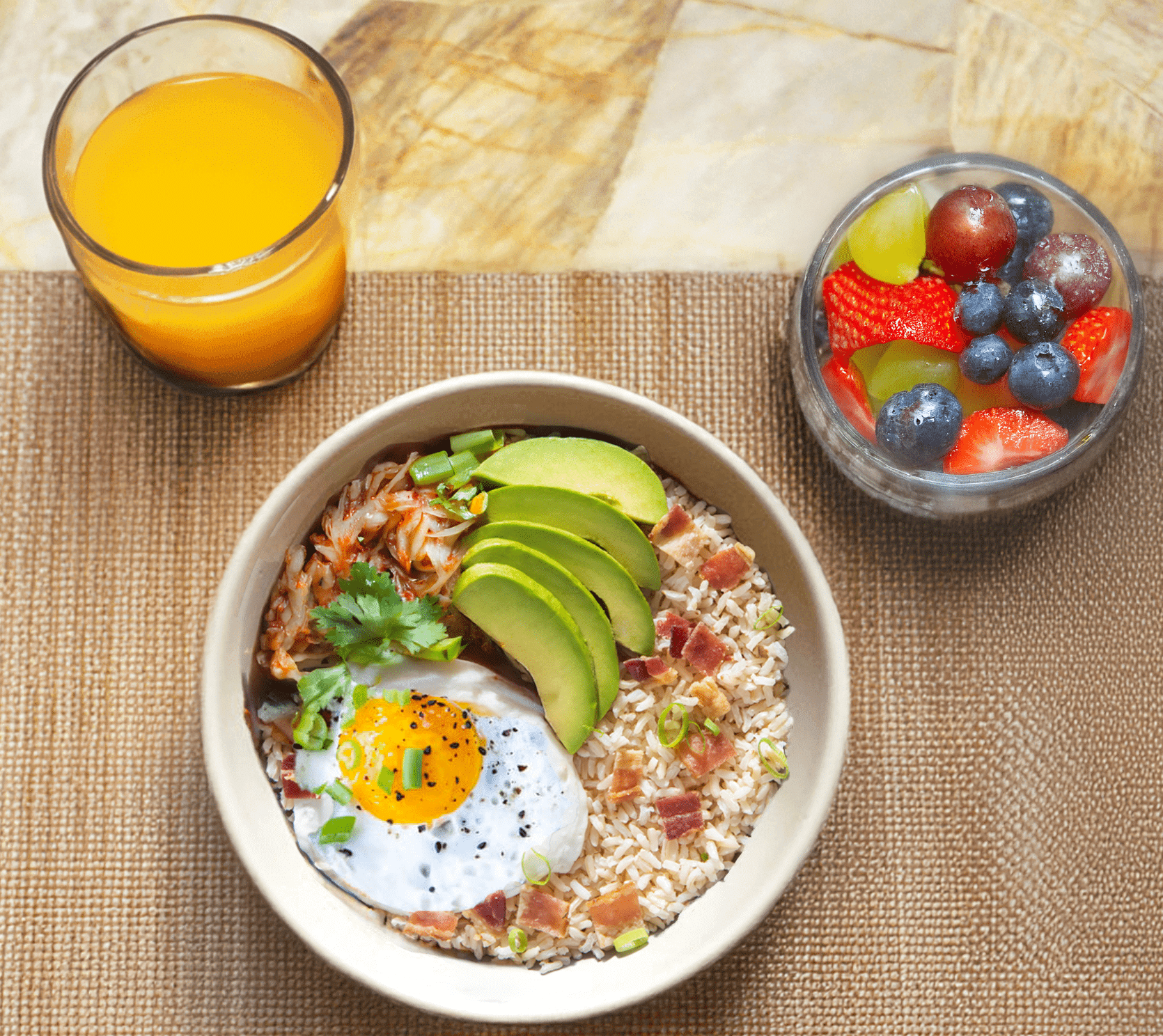 - Assemble bowls: Divide rice between bowls. Top with kimchi, fried egg, bacon mixture, sliced avocado, scallion greens, sesame seeds, and nori, if using.