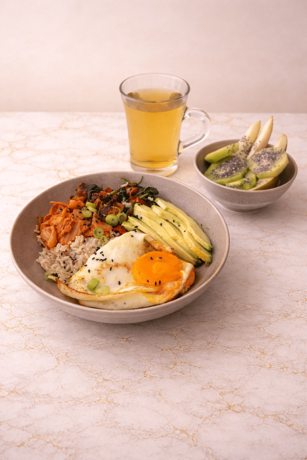 - Serve the kimchi breakfast bowl with fruit and green tea.