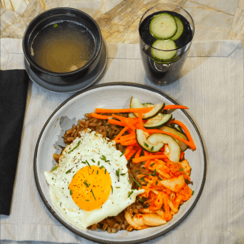 - Assemble bibimbap: Portion the rice. Top with vegetables, fried egg, kimchi, a spoonful of gochujang optional, cucumber banchan, and sesame seeds if desired.