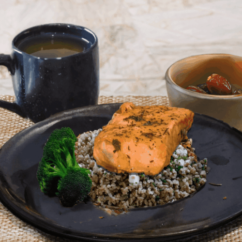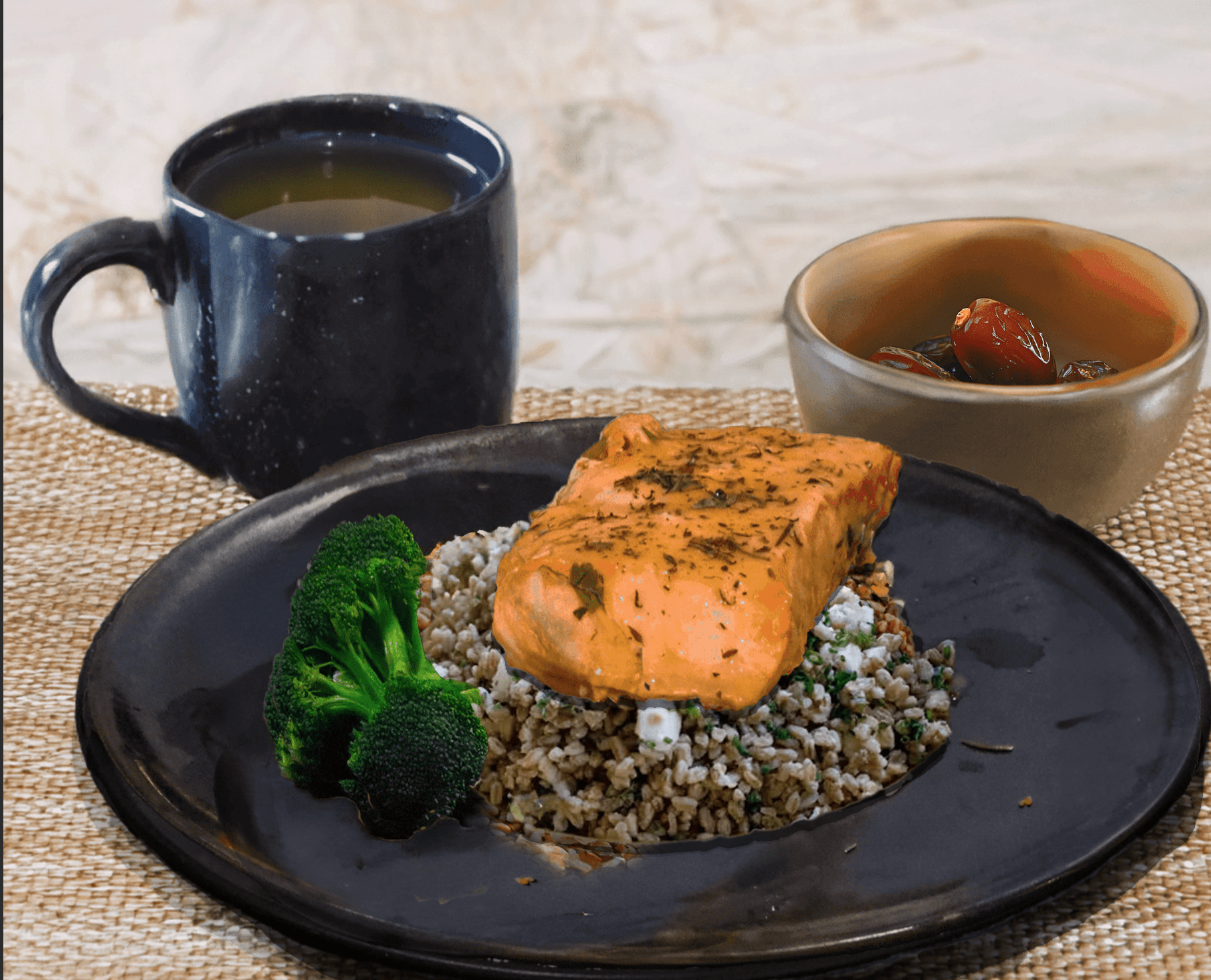 - Serve the salmon with lemon herb farro, steamed broccolini, mint tea and dates.