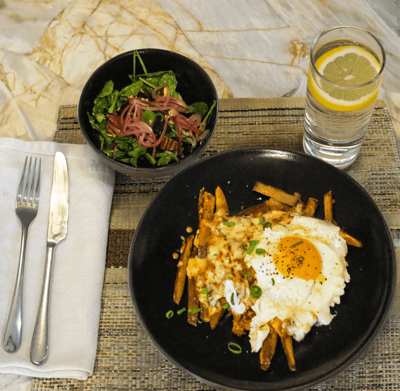 - Serve loaded sunrise fries with the arugula salad and lemon sparkling water.