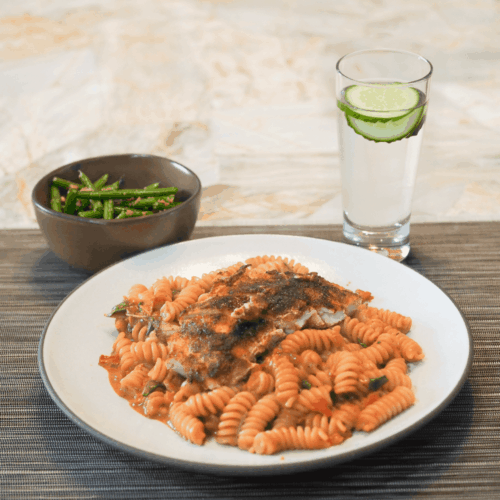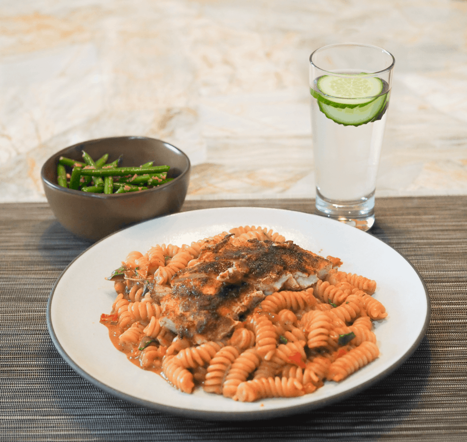 - Serve the pasta with sautéed green beans and cucumber water.