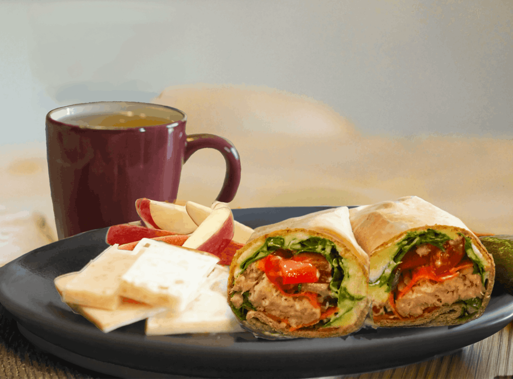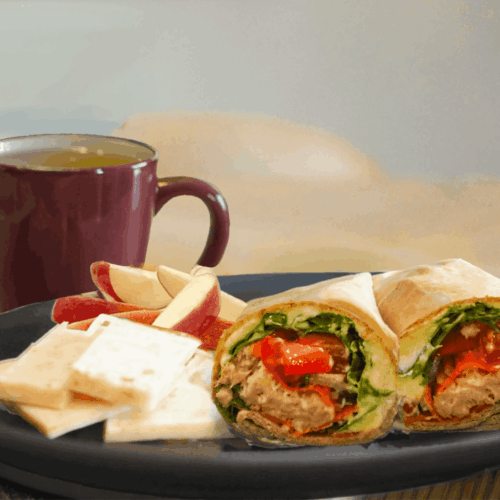 • Serve the wraps alongside the apple slices, cheese, pickle spears, and hot chamomile tea.