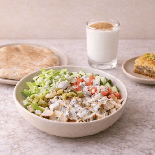 - Serve the shawarma bowls with pita, baklava for dessert, and cinnamon milk.