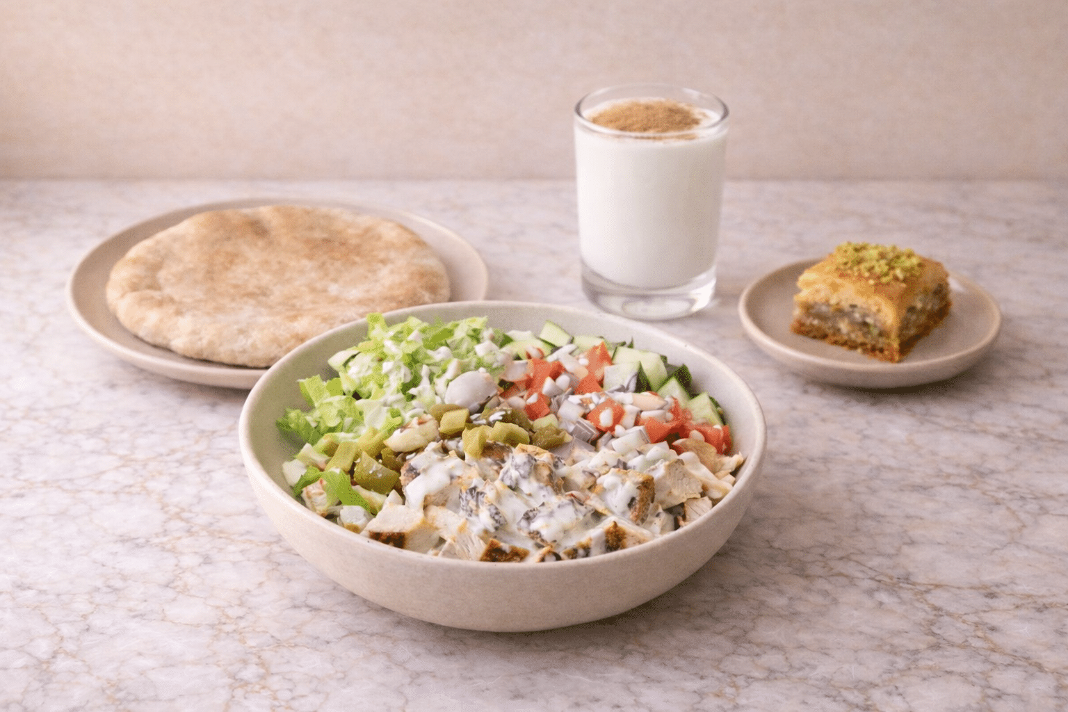 - Serve the shawarma bowls with pita, baklava for dessert, and cinnamon milk.