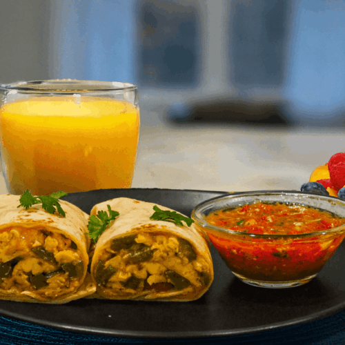 • Serve burritos with salsa, sour cream, hot sauce, and chopped cilantro if desired, fruit and orange juice.