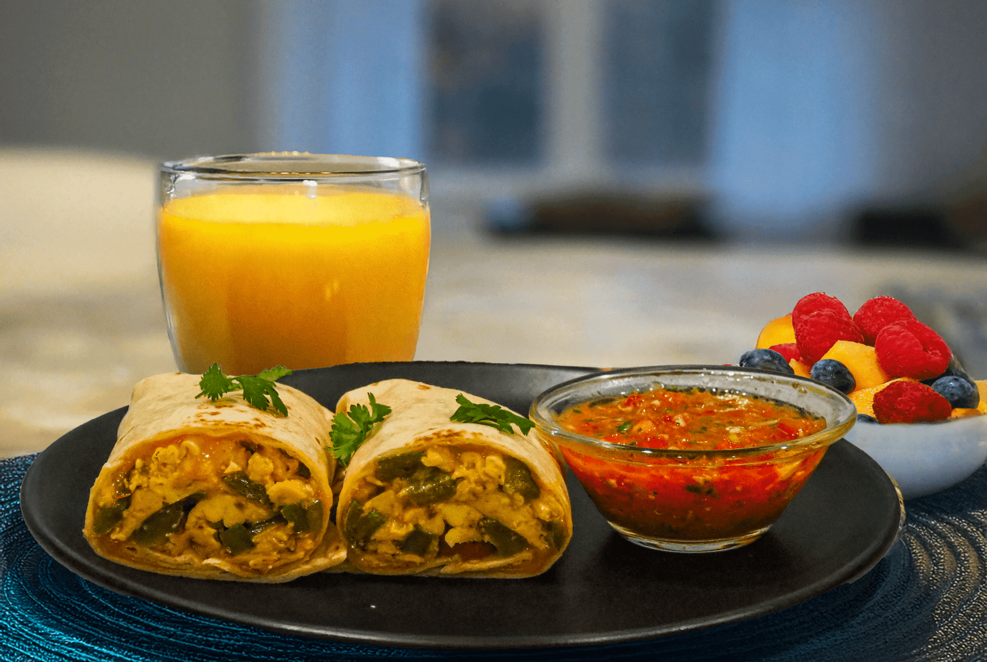 • Serve burritos with salsa, sour cream, hot sauce, and chopped cilantro if desired, fruit and orange juice.
