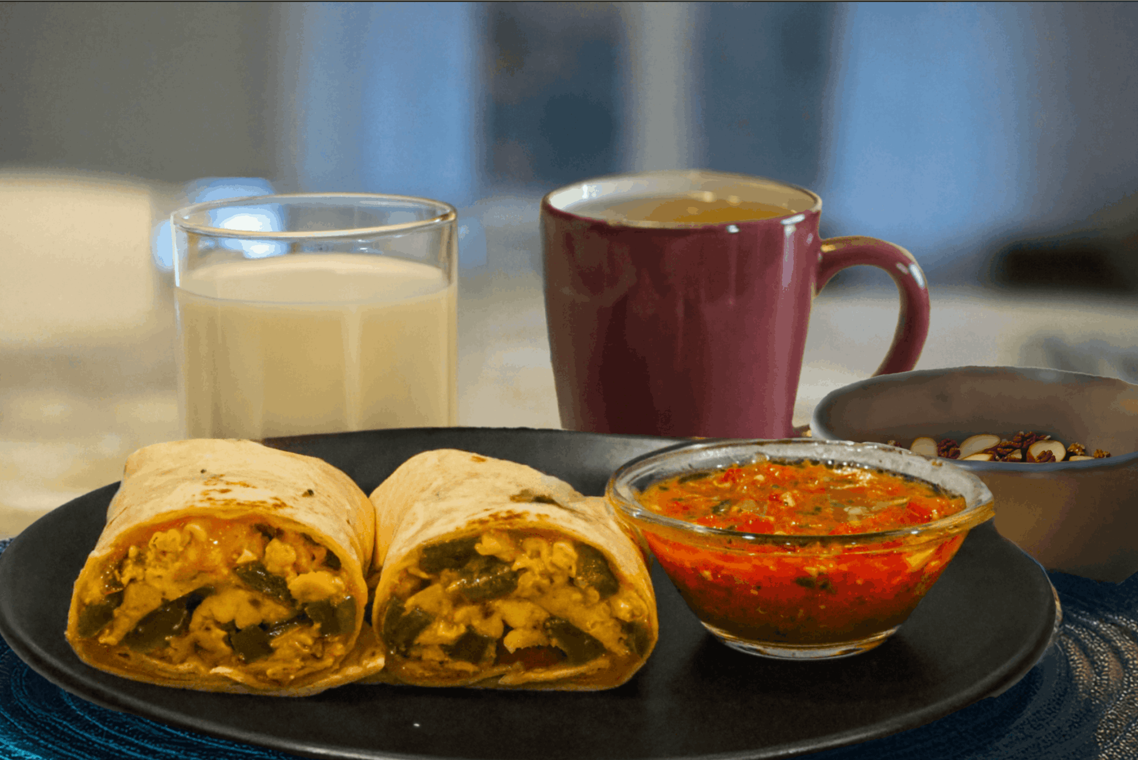 - Serve the burrito with salsa, fruit, green tea, and milk.