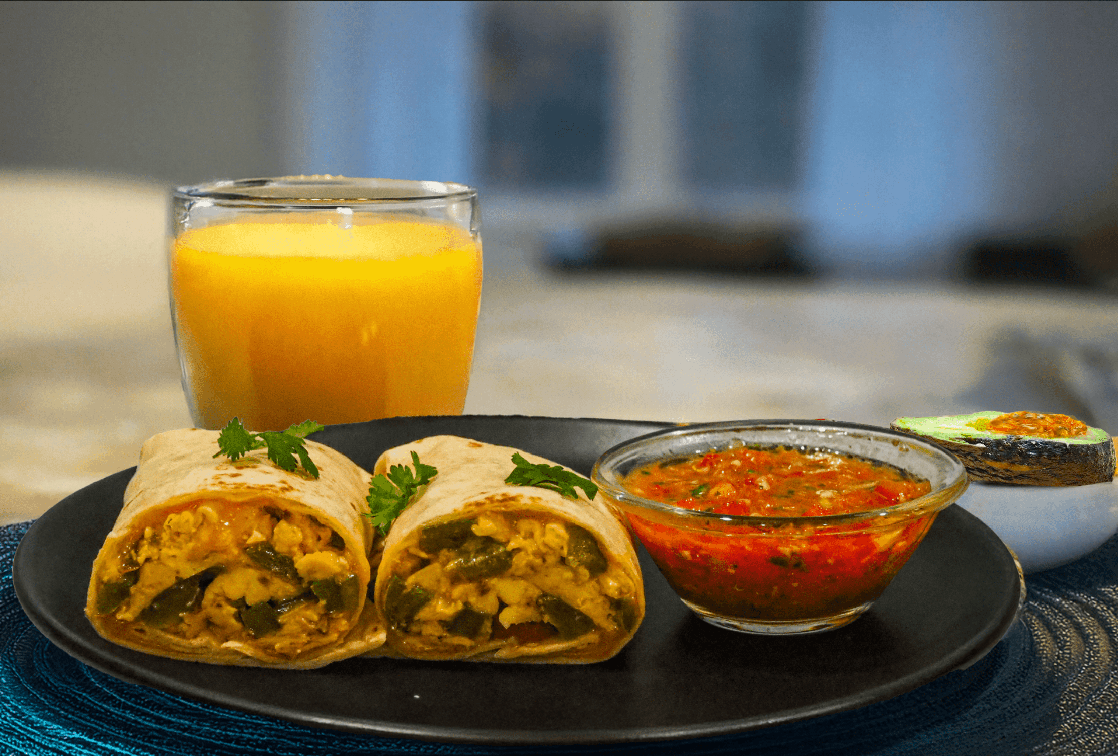 • Serve the burritos with optional salsa, sour cream, hot sauce. Serve alongside passionfruit and avocado and orange juice.