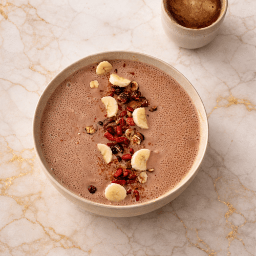 - Top with the fresh fruit. Add any optional toppings such as chia seeds, softened goji berries, chopped toasted hazelnuts, and ground cinnamon if desired.