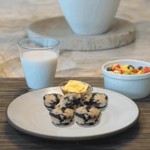 - While muffins bake or cool, portion fruit onto plates and pour milk into glasses.