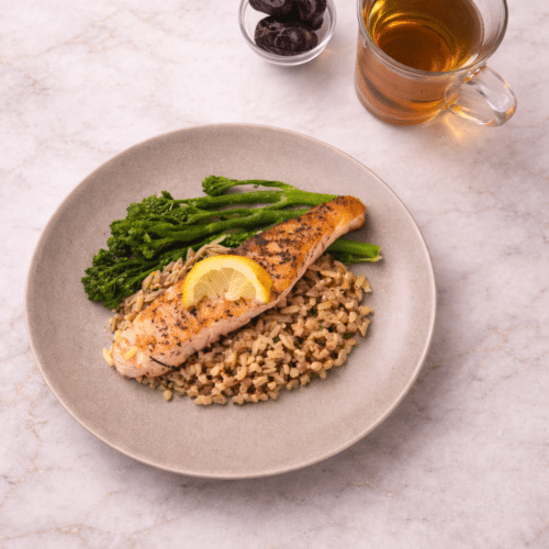 - Serve the salmon with lemon herb farro, steamed broccolini, mint tea and dates.