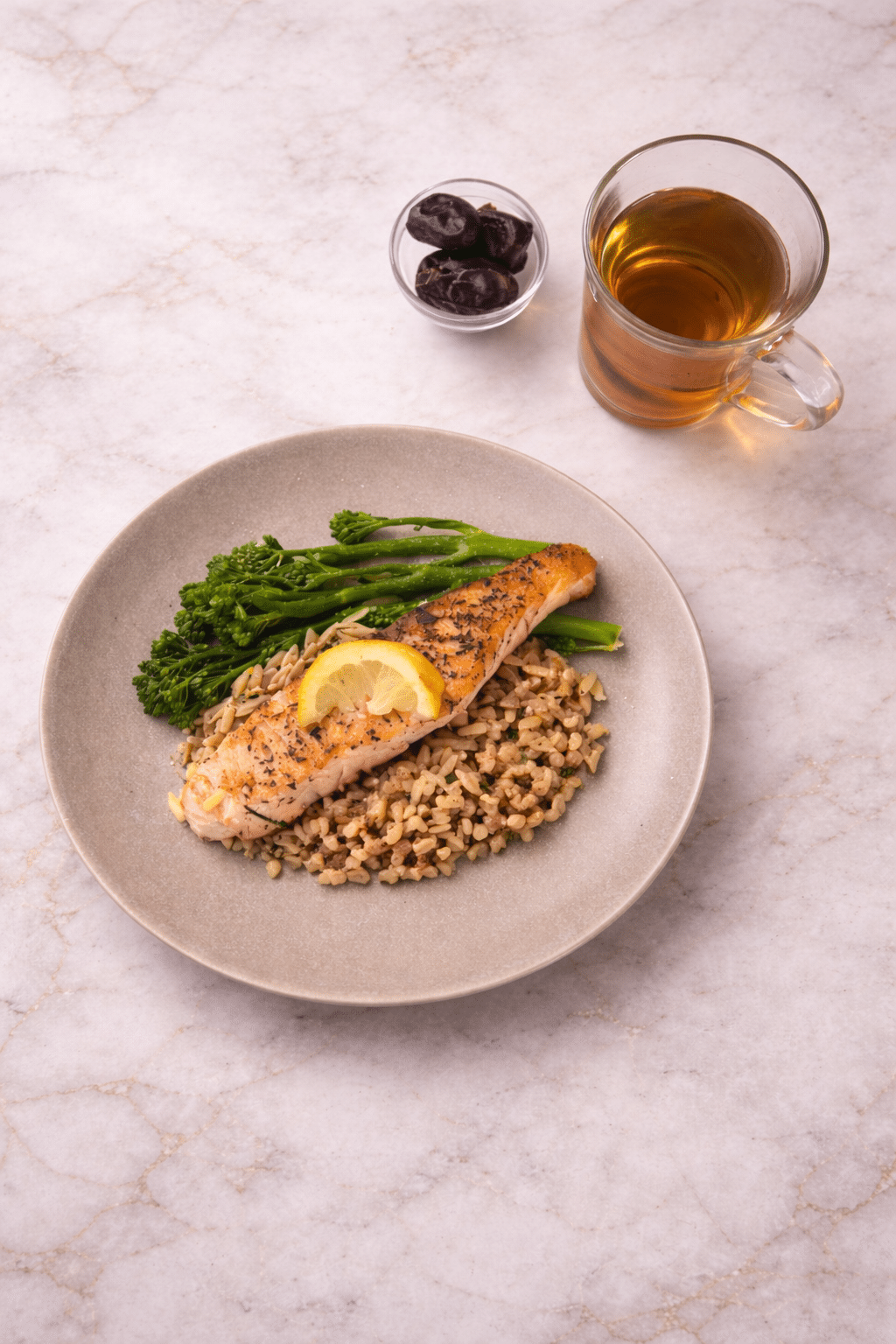 - Serve the salmon with lemon herb farro, steamed broccolini, mint tea and dates.