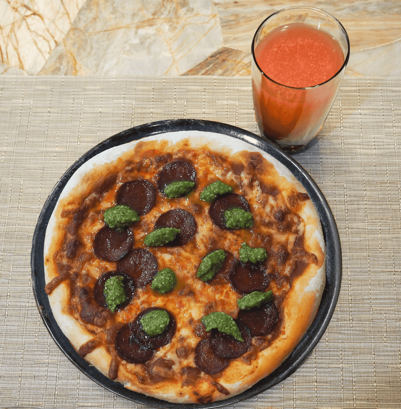- Portion the pizza and enjoy it with kombucha.