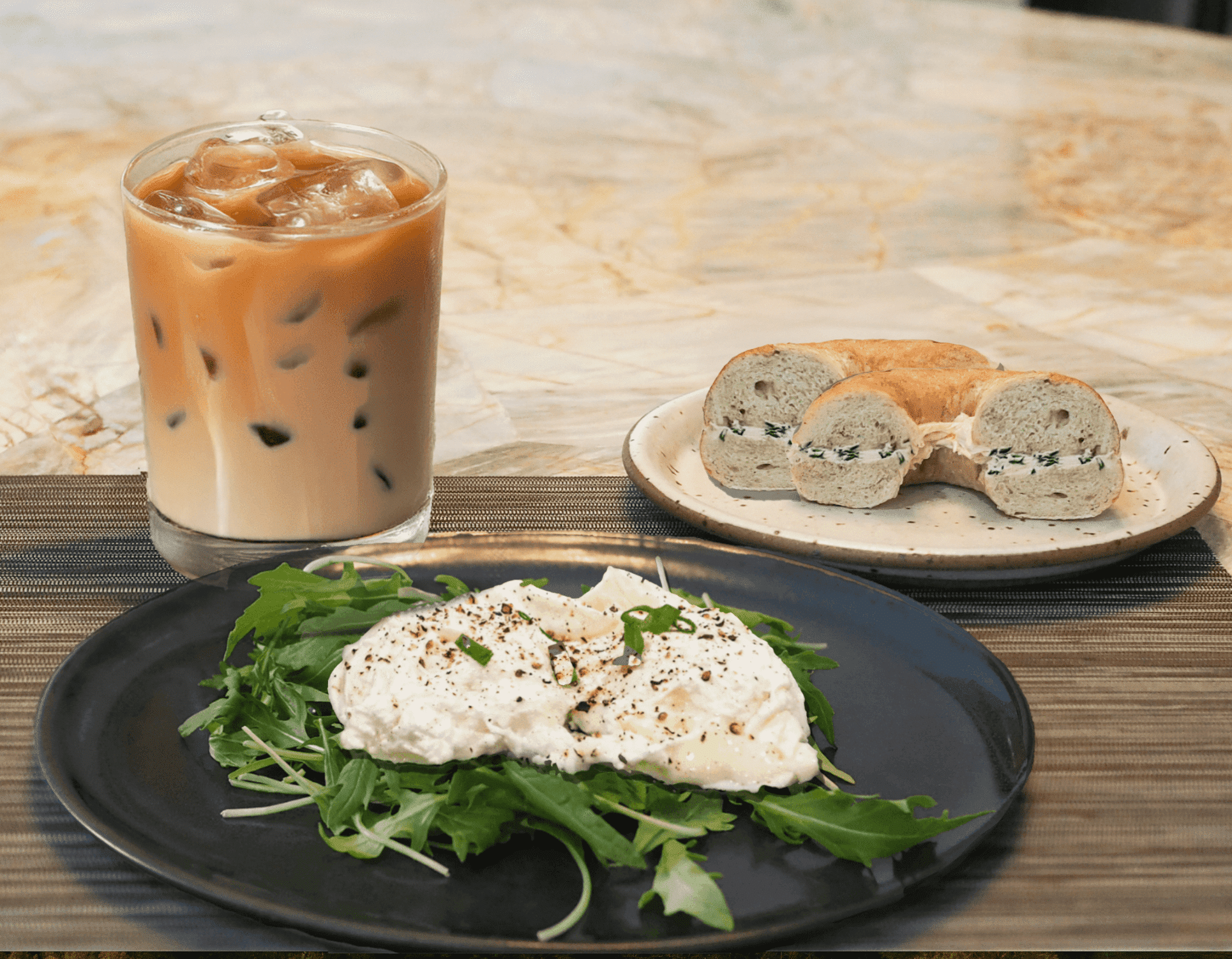 - Serve poached eggs with arugula alongside the bagel and iced coffee.