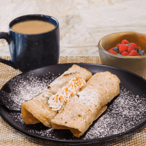 - Spread a spoonful of pumpkin whipped cream filling inside each crepe and fold or roll. Serve with a side of fruit and coffee.