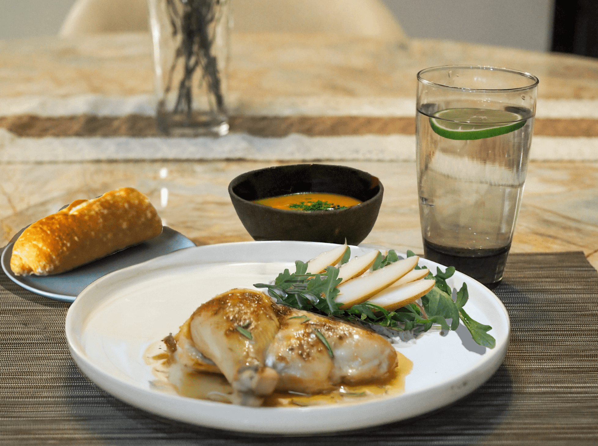 - Serve the roasted chicken with pan juices, alongside pumpkin soup, crusty bread, arugula salad, and lime spritzer.