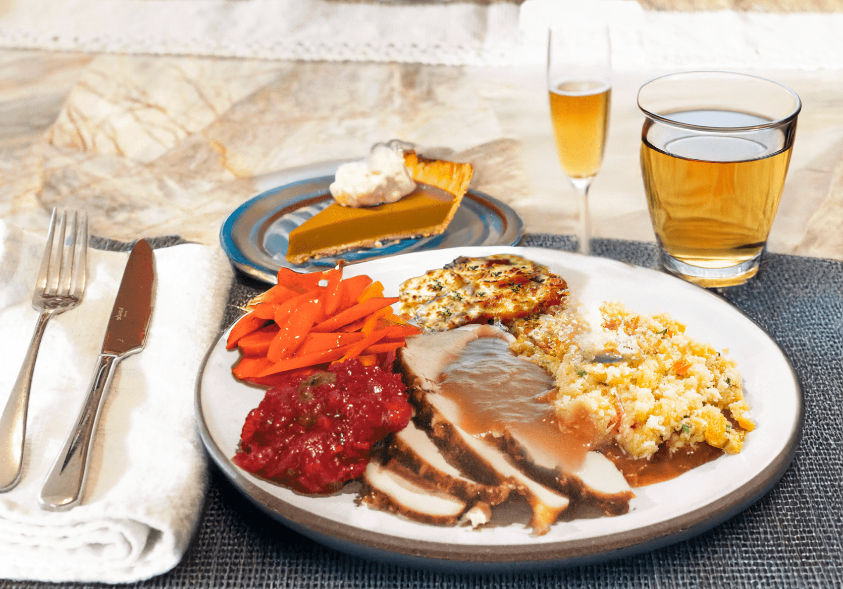 - Serve the turkey with cornbread stuffing, root vegetable boulangère, glazed carrots, cranberry sauce, gravy, apple cider, pumpkin pie topped with homemade vanilla ice cream, and hard apple cider.