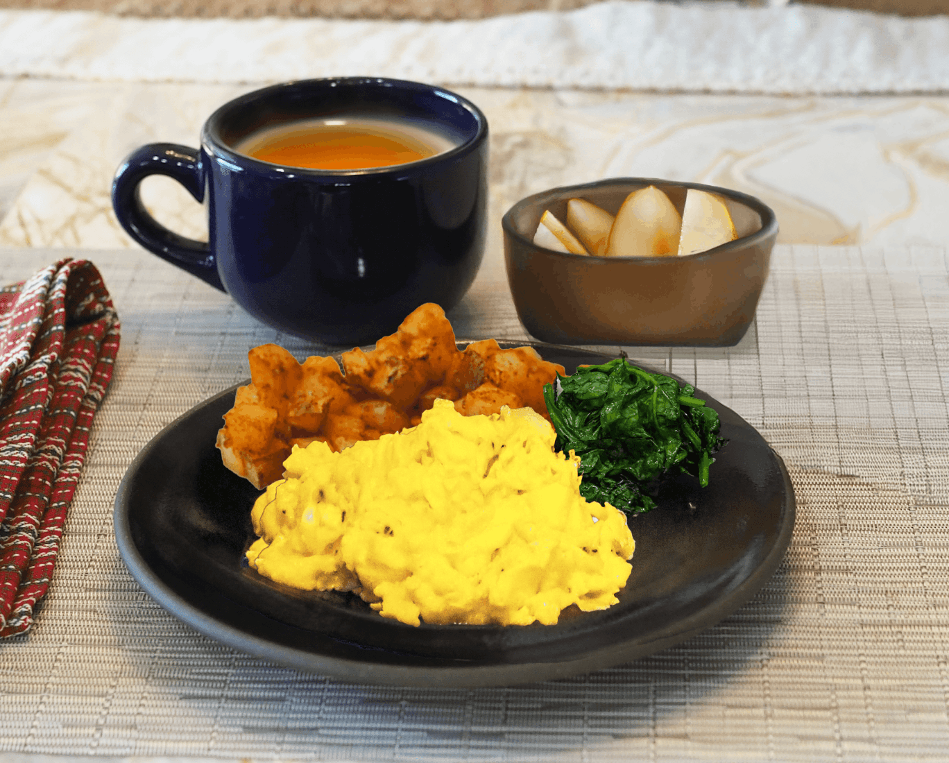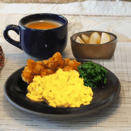 - Serve the scrambled eggs with roasted potatoes, sautéed spinach, pear slices and tea.