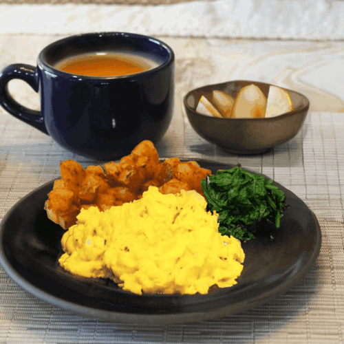 - Serve the scrambled eggs with roasted potatoes, sautéed spinach, pear slices and tea.