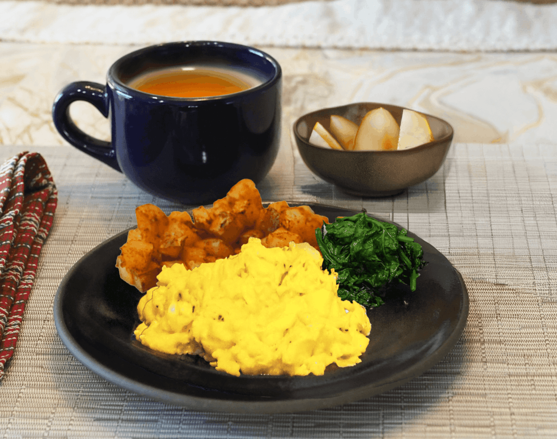 - Serve the scrambled eggs with roasted potatoes, sautéed spinach, pear slices and tea.
