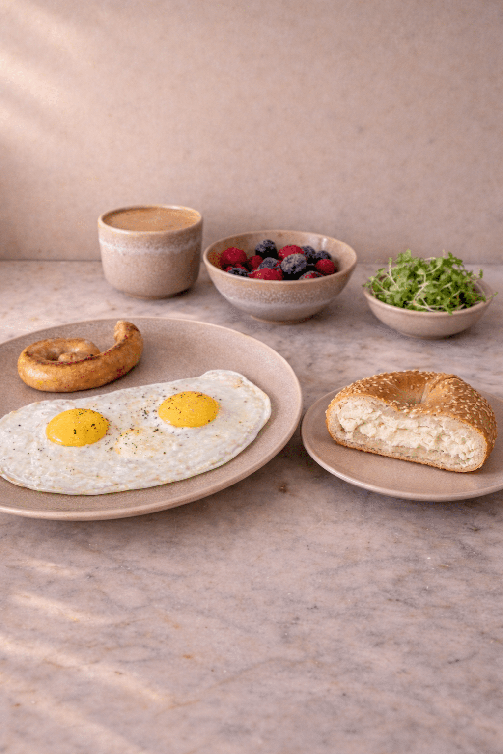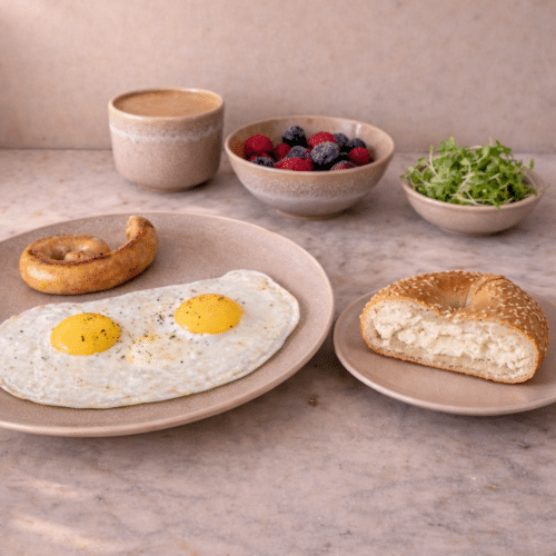 • Serve the eggs with turkey sausage, ½ bagel, fresh berries, microgreens, and coffee.