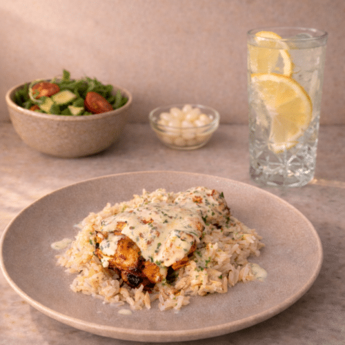 - Serve with the salad and lemon sparkling water.