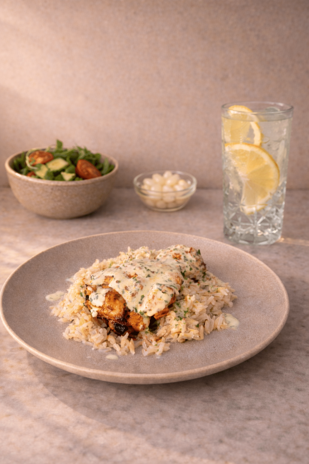 - Serve with the salad and lemon sparkling water.