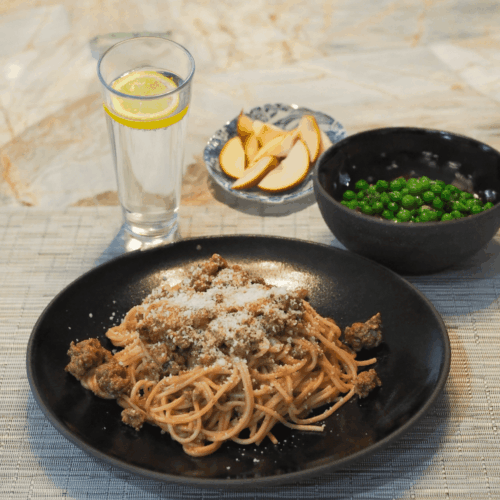 - Serve the spaghetti with grated Parmesan cheese, peas, pears, and lemon sparkling water.