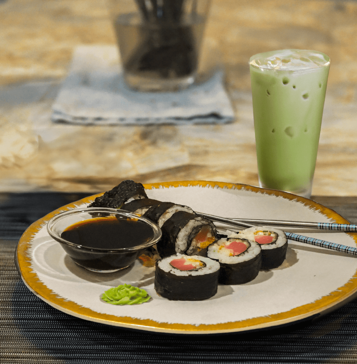 - Serve the sushi rolls with wasabi, pickled ginger, soy sauce, and a glass of iced matcha latte. Enjoy.