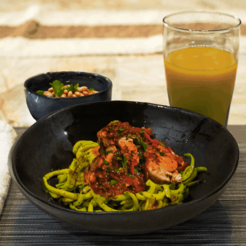 - Plate the chicken and sauce over the zucchini noodles. Serve with white bean and arugula salad and mango lassi. Enjoy!