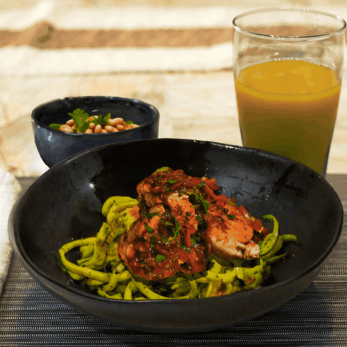 - Serve the chicken over zucchini noodles, with white bean and arugula salad and mango lassi.
