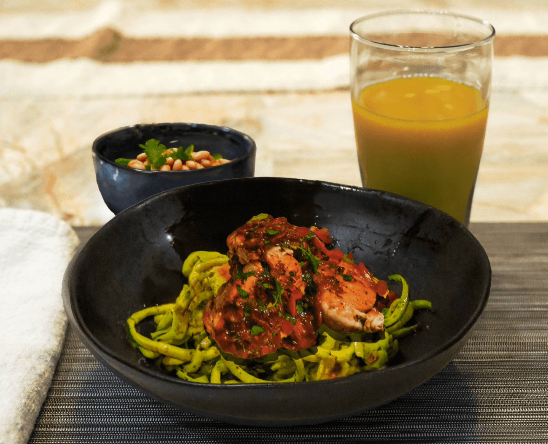 • Serve the chicken over zucchini noodles. Garnish with parsley if desired. Serve with white bean and arugula salad and mango lassi.