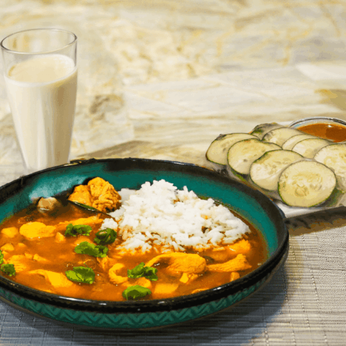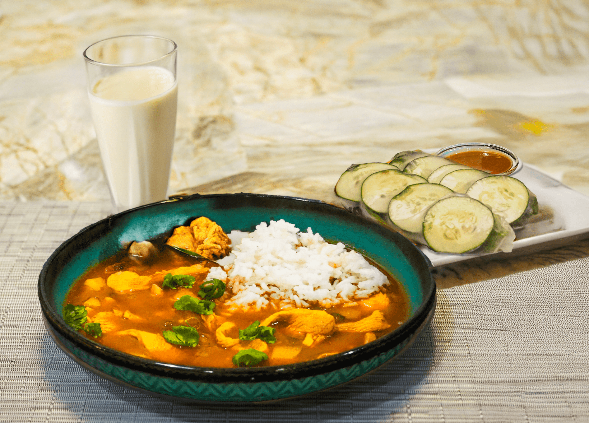 - Serve the Thai yellow curry over rice. Plate with spring rolls and peanut sauce on the side. Pour Korean banana milk into glasses and enjoy.