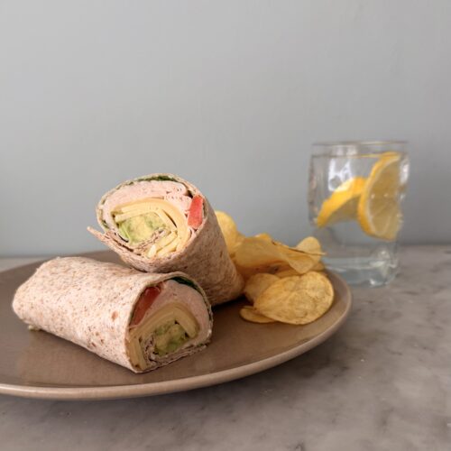 - Serve the wraps with potato chips and lemon sparkling water.