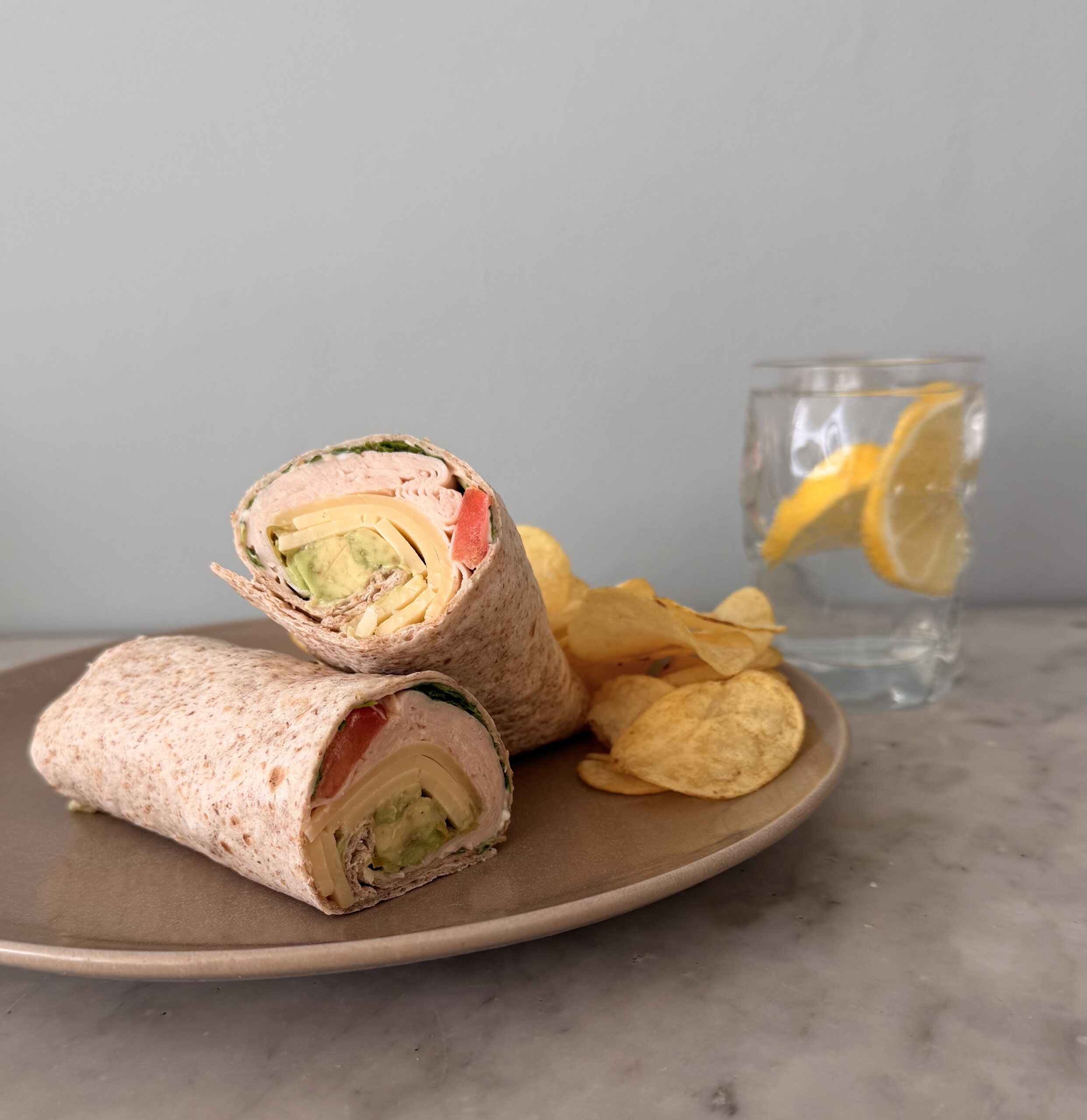 - Serve the wraps with potato chips and lemon sparkling water.