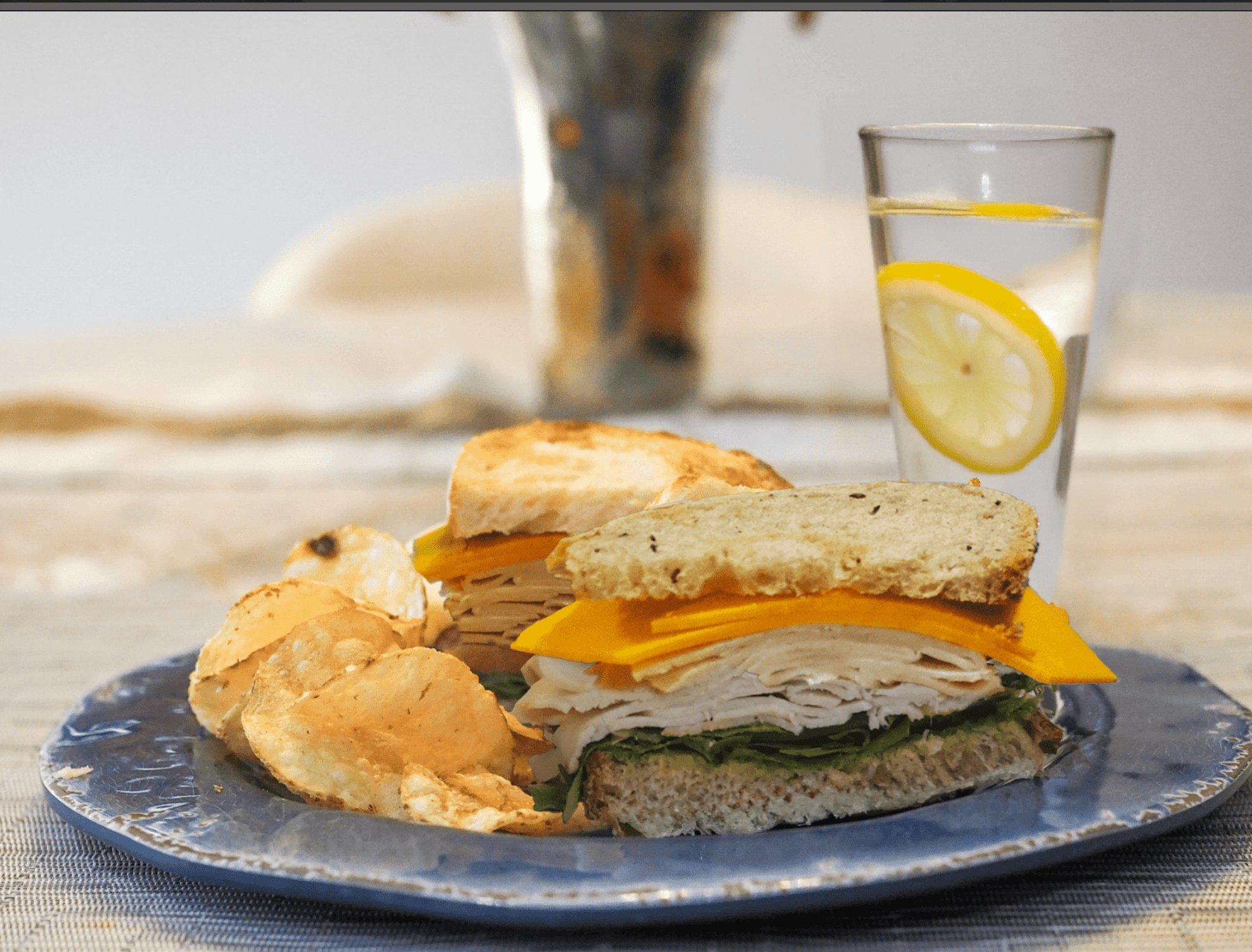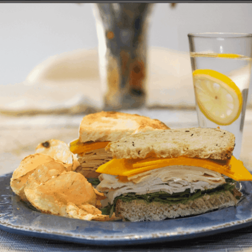 • Serve the sandwich with chips, pickle, and lemon sparkling water.