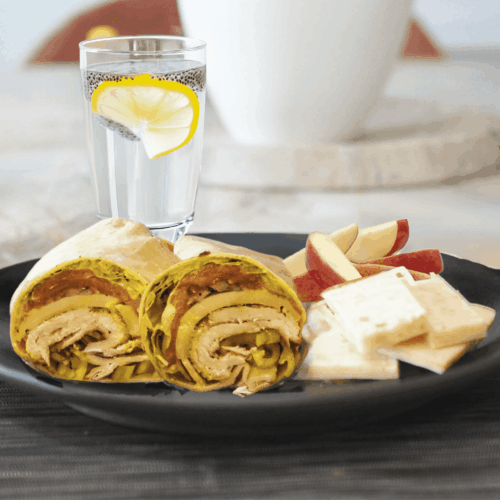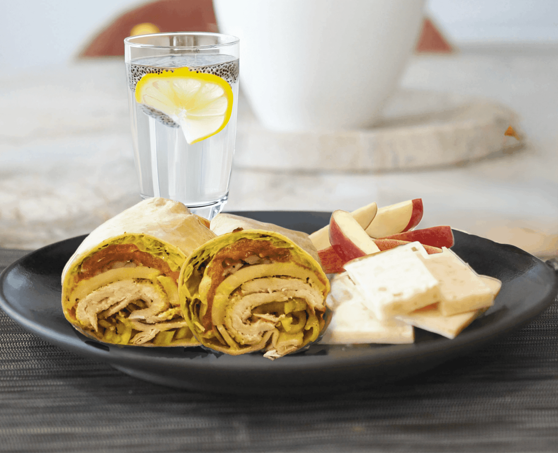 • Serve the wraps with sliced apple, sliced cheese, and lemon chia sparkling water.