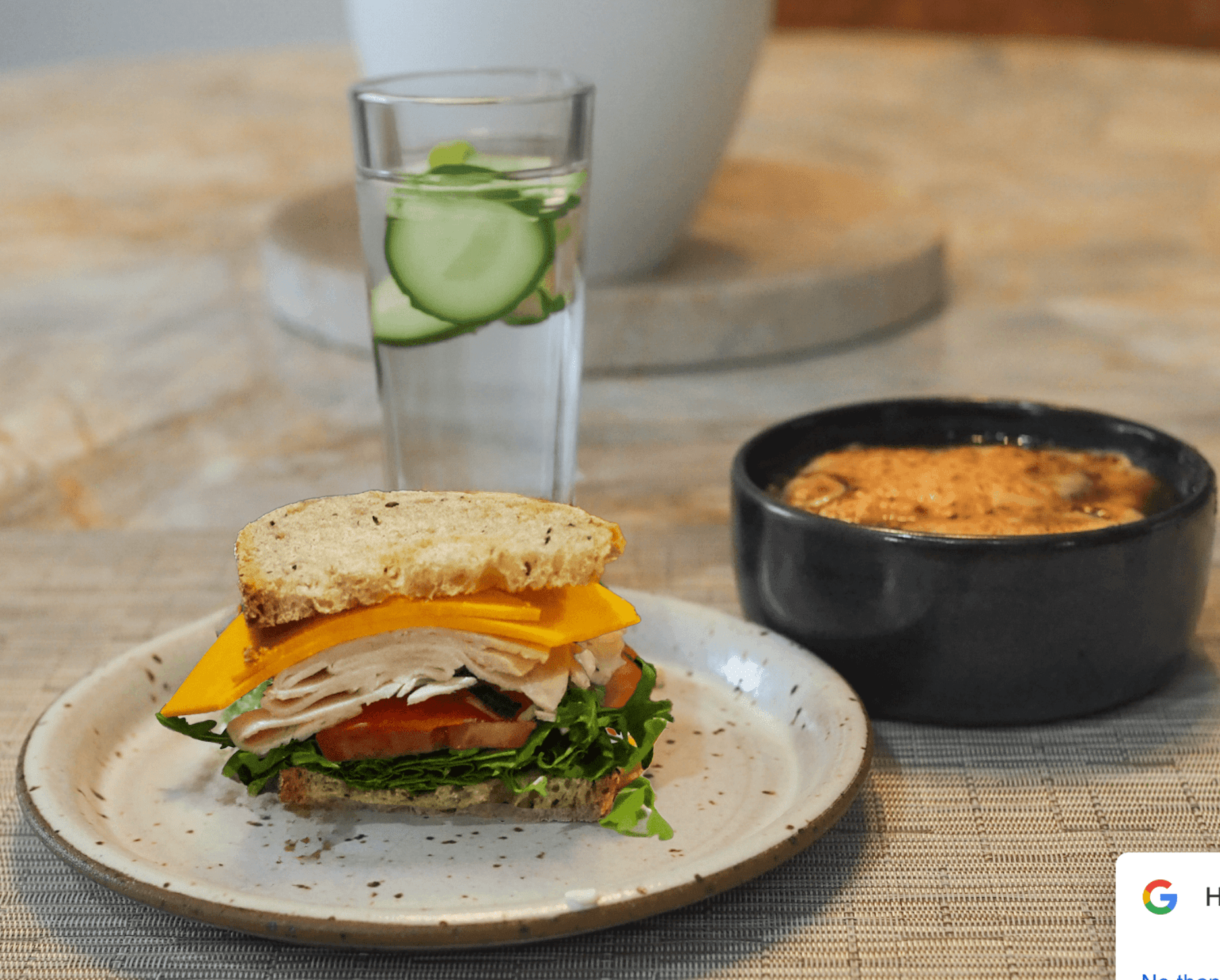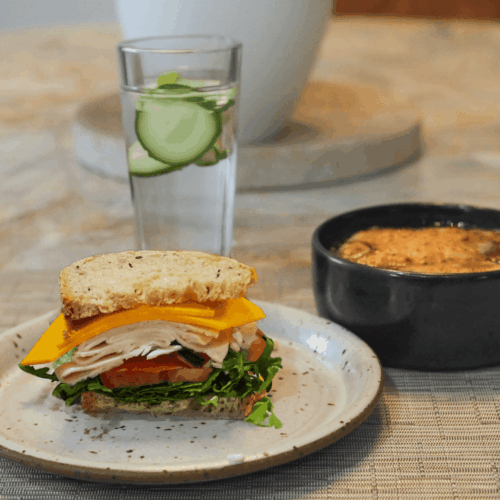 • Serve the French onion soup topped with the cheesy crostini alongside 1/2 turkey and cheese sandwich and cucumber water.