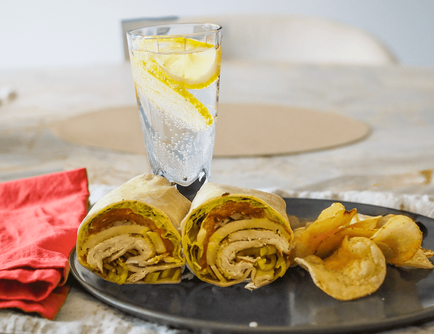 - Serve the turkey wraps with potato chips and lemon chia sparkling water.
