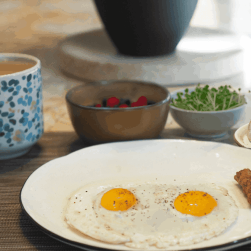 - Serve the 1/2 bagel with eggs, chicken sausage, microgreens, berries, and coffee.